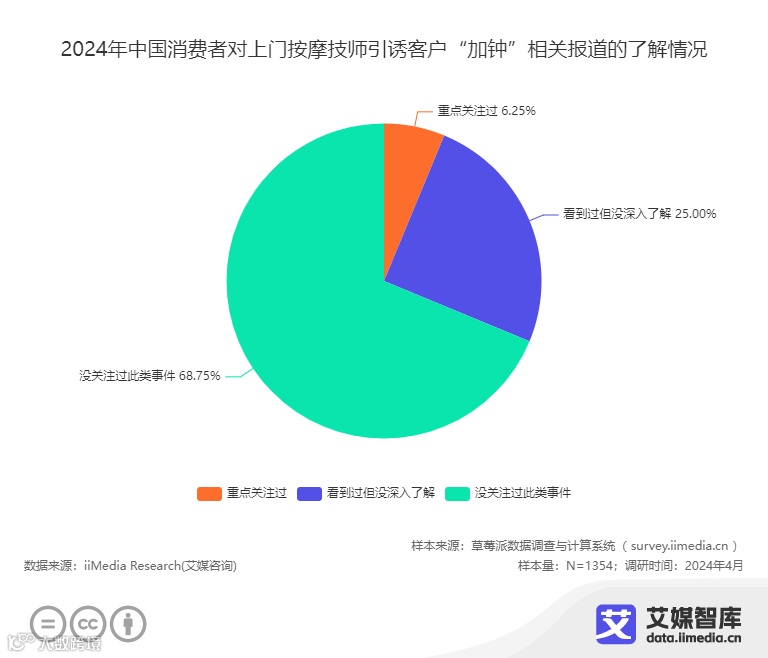 iiMedia Research(艾媒咨询)数据显示,在探讨中国消费者对上门按摩技师引诱客户“加钟”相关报道的了解情况时,有6.25%的消费者表示曾重点关注过此类事件,25.00%的消费者表示虽然看到过相关报道,但并未深入了解其背后的详情,而高达68.75%的消费者则表示自己从未关注过此类事件。