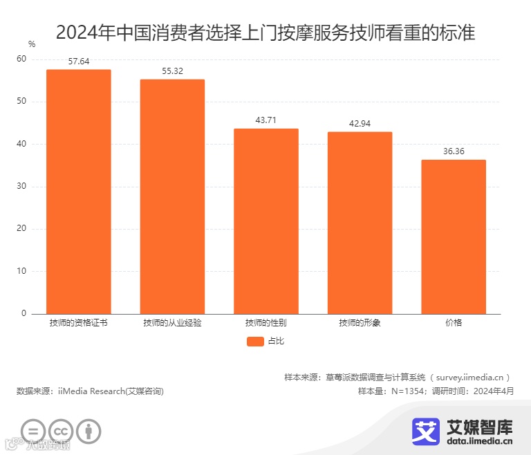 iiMedia Research(艾媒咨询)数据显示,在中国消费者选择上门按摩服务技师看重的标准调研中,57.64%的消费者首要关注技师是否持有相应的资格证书;55.32%的消费者注重技师的从业经验;43.71%的消费者在选择时会考虑技师的性别;42.94%的消费者则看重技师的形象;36.36%的消费者会考虑价格因素,确保服务既优质又合理。这些数据体现了消费者在选择上门按摩服务技师时的多维考量标准。