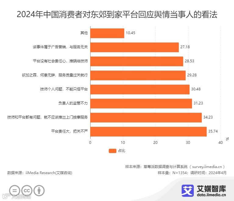 iiMedia Research(艾媒咨询)最新数据揭示了中国消费者对“东郊到家”平台在舆情事件中回应的看法。其中,35.74%的消费者认为平台责任重大,存在把关不严的问题;34.23%的消费者则指出技师和平台均存在问题,对上门按摩服务的推出表示质疑;31.23%的消费者将问题归咎于监管不力;30.48%的消费者则认为技师个人问题应为主要责任,不应过度归咎于平台;另有29.28%的消费者表示,只要服务质量过关,就不应过度苛责。