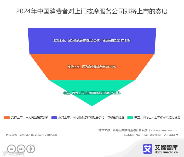 iiMedia Research(艾媒咨询)数据显示,在中国消费者对上门按摩服务公司上市的态度上,呈现出多样化的观点。具体而言,36.79%的消费者支持上市,他们认为这是商业模式的创新;然而,37.83%的消费者则持反对态度,担忧公司上市可能带来的法律和社会公德挑战,尤其是担心可能加剧色情服务的泛滥;还有25.38%的消费者持中立观点,认为无论公司是否上市,消费者都可以选择是否进行消费。