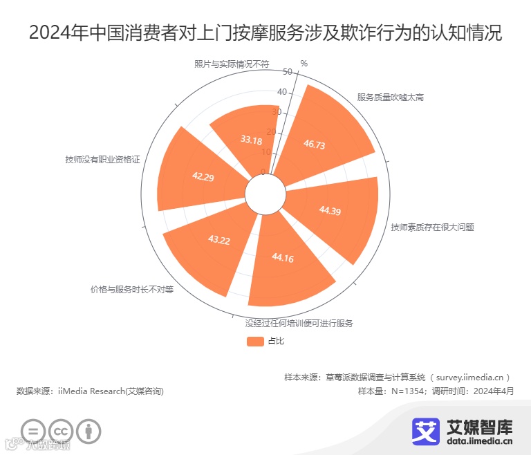 iiMedia Research(艾媒咨询)的数据揭示了中国消费者对上门按摩服务中欺诈行为的认知情况。64.26%的人认为存在服务过程中欺诈行为,而35.74%的人则持相反观点。进一步分析消费者对欺诈行为的具体认知:46.73%的消费者认为服务质量被过度吹嘘,实际体验与宣传不符;44.39%的消费者指出技师素质存在严重问题;44.16%的消费者担忧技师未经过专业培训便提供服务;43.22%的消费者则反映价格与服务时长不对等;42.29%的消费者关注技师是否持有职业资格证。