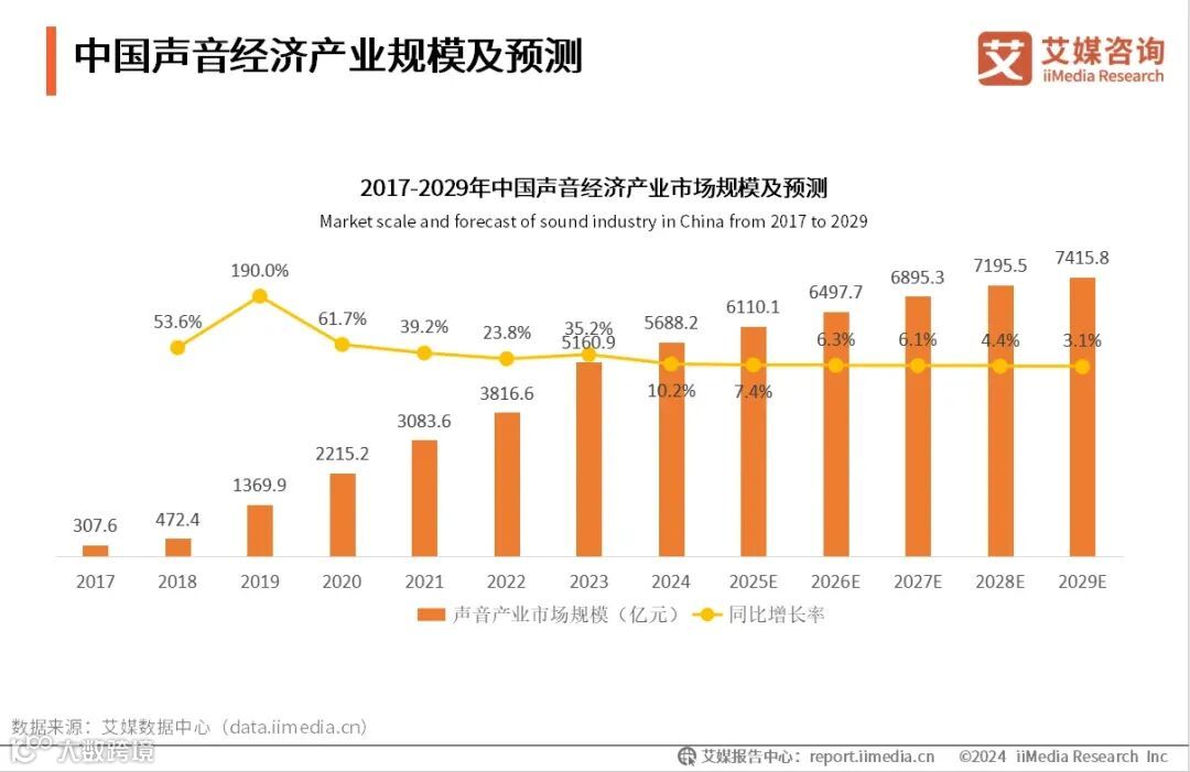 iiMedia Research(艾媒咨询)数据显示,2024年中国声音经济产业市场规模达5688.2亿元,预计2029年将突破7400亿元。艾媒咨询分析师认为,随着用户对于声音内容的付费习惯逐渐养成,中国声音经济的市场规模有望进一步扩张,未来几年预计保持平稳增长态势。