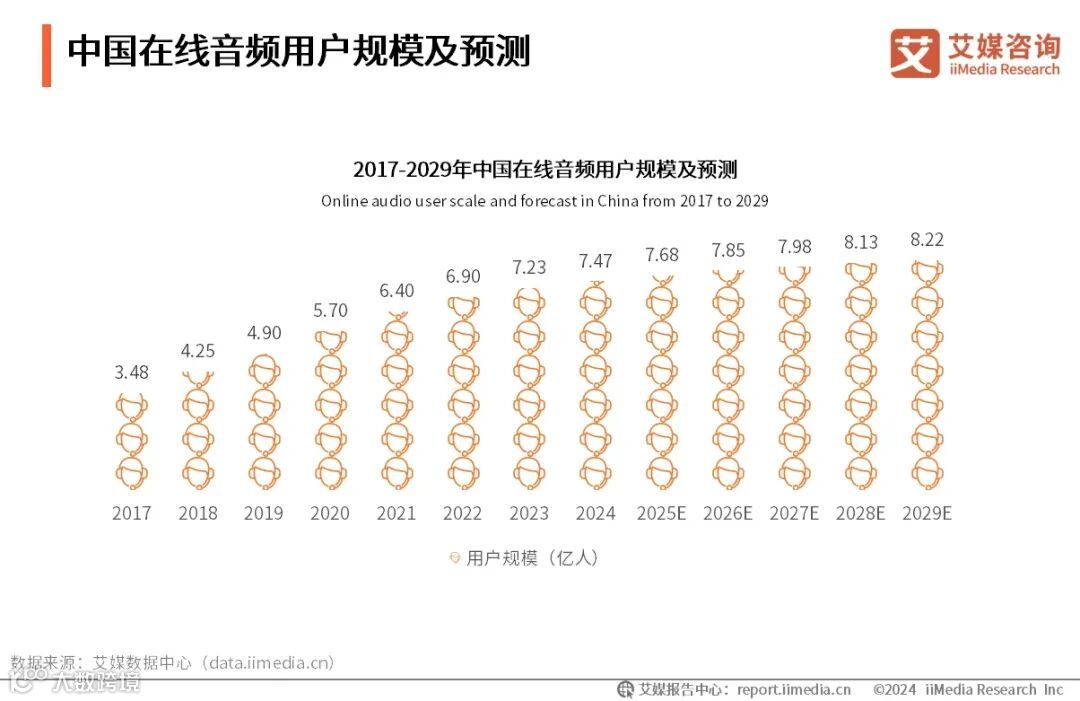 iiMedia Research(艾媒咨询)数据显示,中国在线音频用户规模保持连续增长,2024年用户规模已达到7.47亿人,预计2029年将达8.22亿人。艾媒咨询分析师认为,在线音频业务不断拓展,用户渗透率提升,网络音频行业形成多元化圈层。