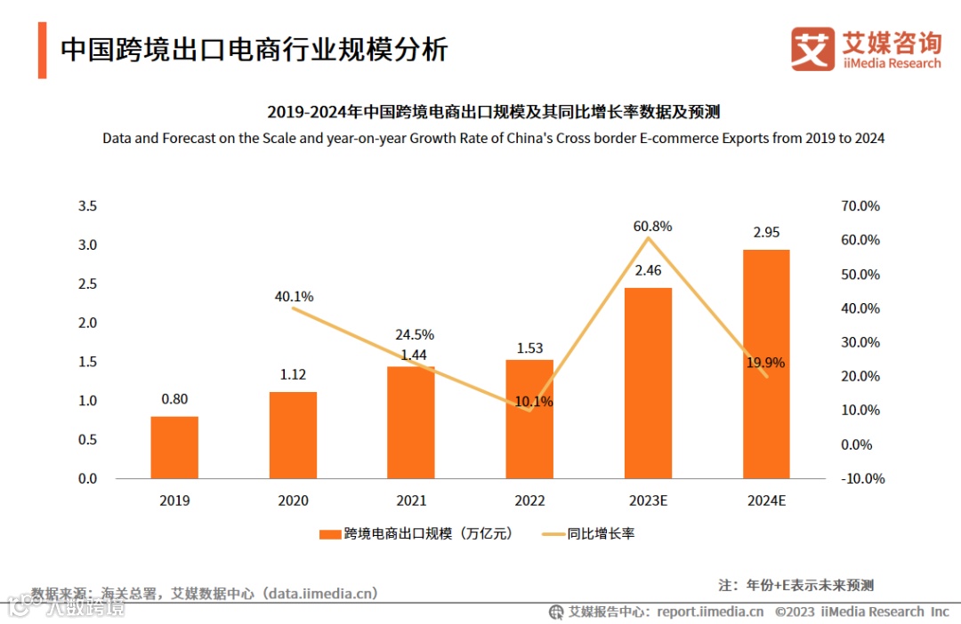 数据显示,2023年上半年,跨境电商进出口额达1.1万亿元,同比增长16%。艾媒咨询分析师认为,跨境贸易往来日益增加以及互联网技术渗透率提升的作用下,中国跨境电商出口规模将持续增长,预计2024年有望达到2.95万亿元。