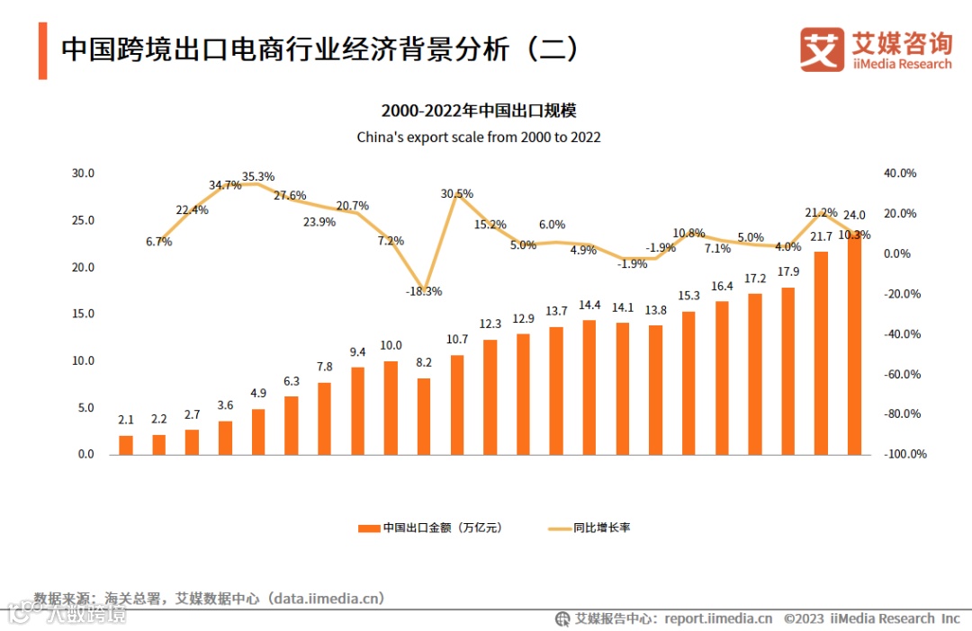 数据显示,2000-2022年中国出口金额复合年均增长率为11.7%;2015-2022年中国出口金额年均复合增长率为7.9%,近年来中国出口金额增速有所放缓,但仍在持续增长的通道中。2022年中国出口总额为24.0万亿元,是世界第一大出口国,跨境出口电商在出口中的渗透率稳步提升。艾媒咨询分析师认为,中国出口贸易的强劲态势有利于跨境出口电商的持续发展。