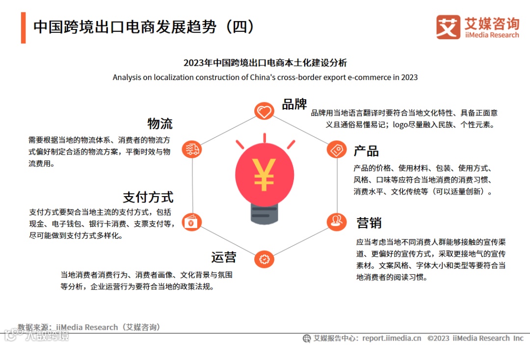 中国跨境出口电商未来将以“本土化”趋势发展。艾媒咨询分析师研究发现,许多跨境出口电商企业在出海时容易受“惯性思维”影响,将中国的经营模式照搬、复制到海外市场。但现实中,照搬的经营模式容易导致“水土不服”。面对不同的国际市场,跨境出口电商要在品牌、产品、营销、物流等方面契合当地的政治、经济和文化背景,才能得到更好的发展。