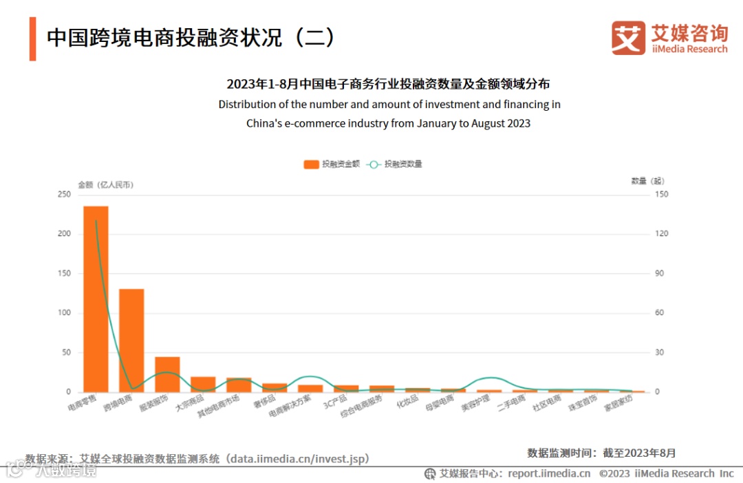 数据显示,随着电子商务行业的发展,综合物流服务及电商解决方案等方面的产业基础逐步形成,这些领域的投融资金额保持相对稳定。2023年中国跨境电商行业在化妆品、母婴、美容等细分领域的投融资数量依旧稳定或有所上升。艾媒咨询分析师认为,随着部分跨境电商行业上下游产业链的不断发展,投融资领域将更加细化。