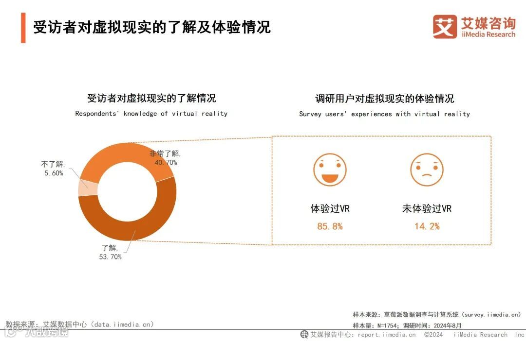 iiMedia Research(艾媒咨询)数据显示,94.4%的受访者表示对虚拟现实有所了解或非常了解。在这些受访者中,有85.8%的人曾经体验过虚拟现实。艾媒咨询分析师认为,随着虚拟现实技术在现实生活中的应用和普及程度不断提高,虚拟现实技术不再是一个陌生或遥远的概念,越来越多的人了解虚拟现实技术甚至有机会亲身感受其带来的沉浸式体验。