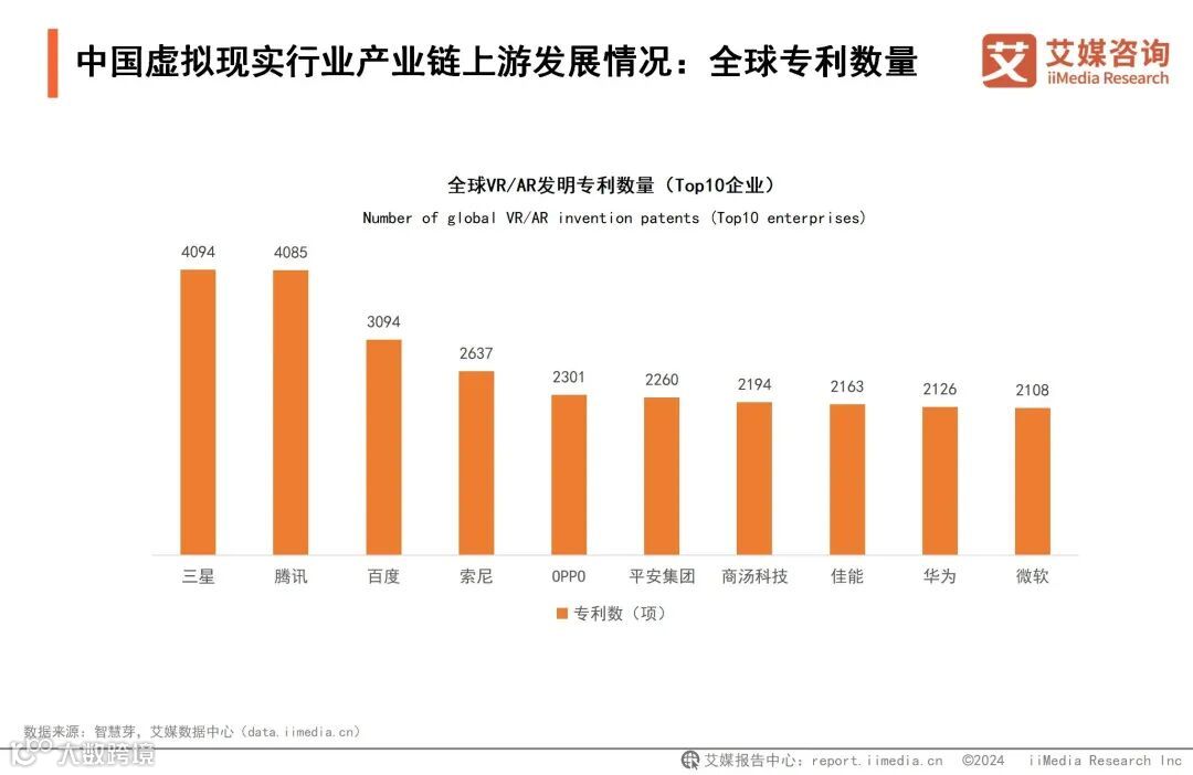 数据显示,三星以4094项专利位居榜首,腾讯的专利数为4085项,仅比三星少9项。其次是百度、索尼、OPPO等企业,专利数分别为3094、2637、2301项。