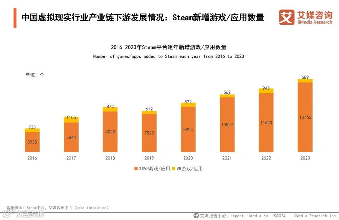 中国虚拟现实行业产业链下游发展情况:Steam新增游戏/应用数量