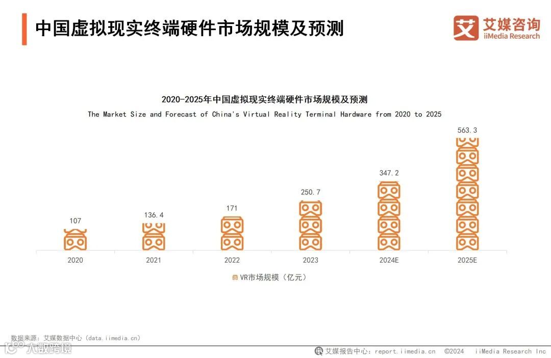 iiMedia Research(艾媒咨询)数据显示,2023年中国虚拟现实终端硬件市场规模为250.7亿元,2025年预计可达563.3亿元。艾媒咨询分析师认为,随着虚拟现实硬件设备的性能不断提升,如分辨率、刷新率、延迟和舒适度等方面的显著改进,用户体验将得到进一步优化。5G、云计算、人工智能等新技术的融合应用,也将为虚拟现实技术提供更加稳定、高速的传输和计算能力,进一步推动终端硬件市场发展。