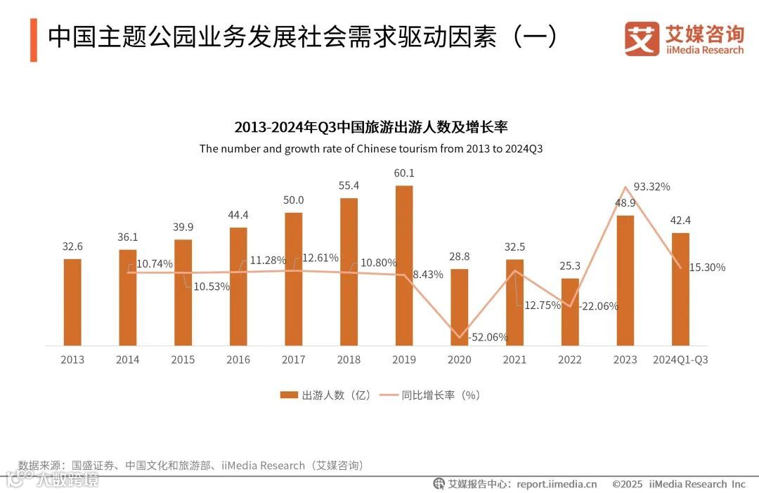 iiMedia Research(艾媒咨询)数据显示,2024年第一季度至第三季度,中国出游人数达42.4亿人,同比增长15.30%。艾媒咨询分析师认为,随着旅游产业的复苏,中产阶级人口增加及亲子游趋势加强,中国主题公园行业亦受到正面影响。