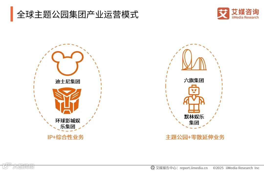 全球主题公园运营商在产业背景、发展历程、主体特色等方面存在差异,从宏观层面上看,其经营模式大致可以划分为以下两类:一是依托IP资源,发展媒体影视、主题公园及衍生品生产等业务,形成完整产业链的综合性集团;另一种是以主题公园为主要业务,业务类型相对单一的专业化集团。