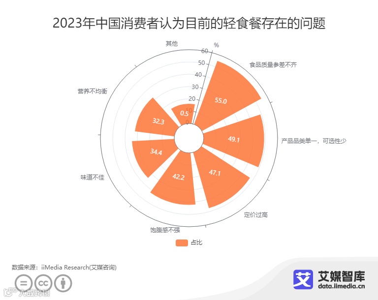 iiMedia Research(艾媒咨询)数据显示,在2023年中国消费者认为目前的轻食餐存在的问题中,55.0%消费者会选择食品质量参差不齐,49.1%消费者会选择产品品类单一,可选性少,47.1%消费者会选择定价过高,42.2%消费者会选择饱腹感不强,34.4%消费者会选择味道不佳。