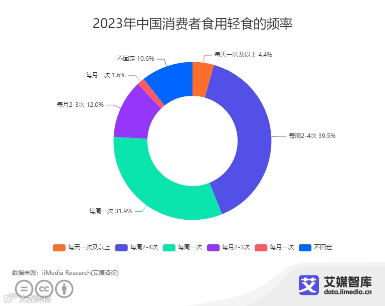 iiMedia Research(艾媒咨询)数据显示,2023年中国消费者食用轻食的频率普遍较高,75.8%的消费者每周至少吃一次轻食,其中4.4%消费者每天吃一次及以上,39.5%消费者每周吃2-4次,31.9%消费者每周吃一次。