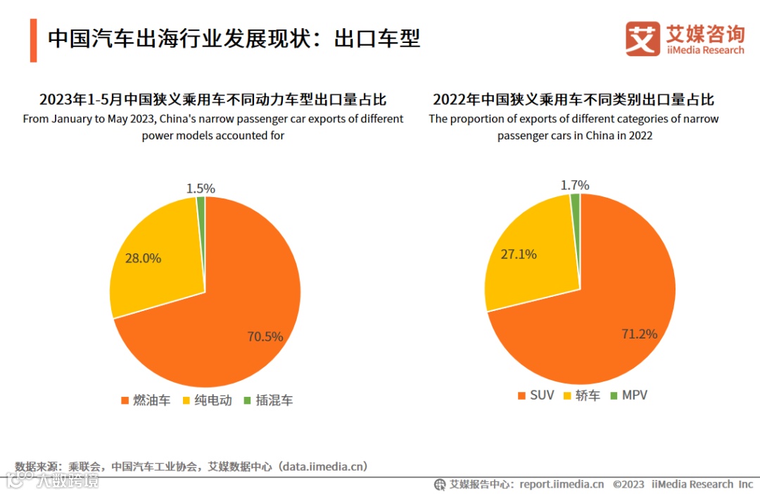 从乘用车出口燃料结构上分析,燃油车仍占出口大头,插混车较少。数据显示,2023年1-5月中国狭义乘用车燃油车、纯电动和插混车出口量分别占比70.5%、28.0%和1.5%;从车型类别上,以SUV车型为主,占比71.2%,轿车和MPV的占比分别为27.1%和1.7%。艾媒咨询分析师认为,中国汽车出海行业出口以燃油车为主,主力车型主要为小型或紧凑型SUV。
