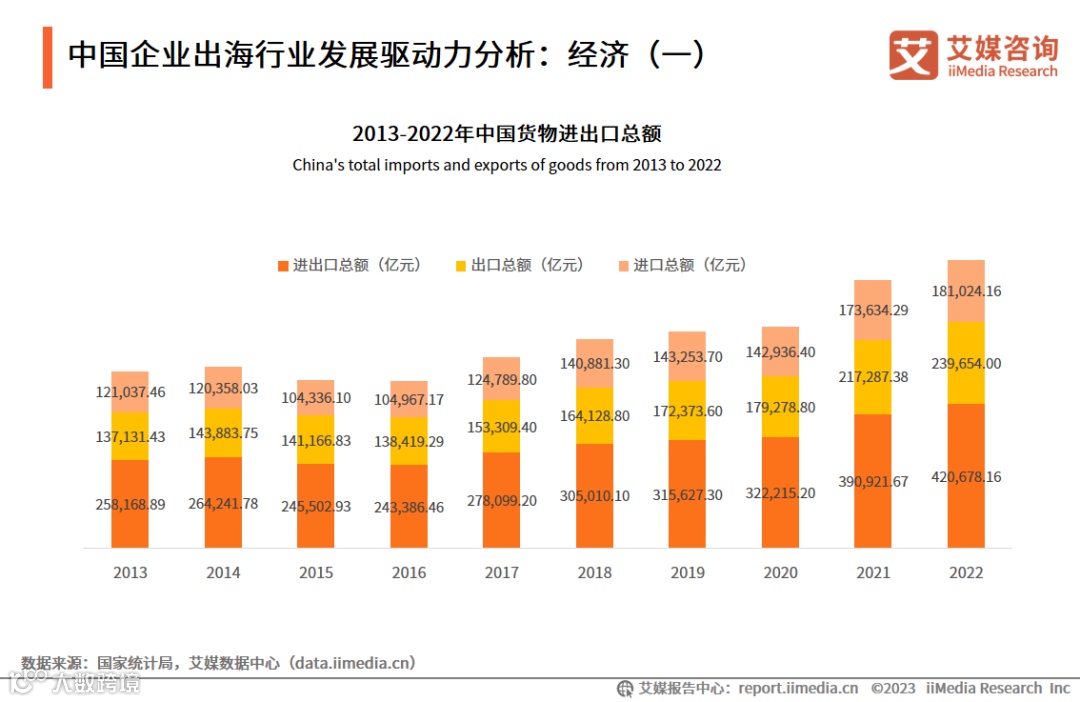 目前,世界经济复苏乏力,全球贸易投资放缓,加上保护主义和地缘政治风险上升等因素虽直接影响到中国对外贸易,但因其良好的产业体系和完备的生产能力,中国经济保持长期向好的基本面。数据显示,2022年中国货物贸易进出口总值达42.07万亿元,在2021年高基数基础上继续保持稳定增长。尽管面临全球需求收缩、供给冲击、预期转弱三重压力,中国外贸进出口仍展现出较强韧性,助力中国外贸实现新的突破,增强企业出海信心。