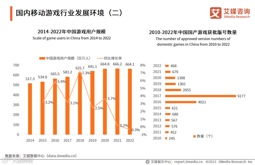 数据显示,中国游戏用户规模总体呈现逐年上涨的趋势,但增长速度有所放缓,2022年达664.1百万人,同比下降0.3%,国内游戏用户及市场规模趋于饱和。从获批版号数量来看,2010-2022年中国国产游戏获批版号数量呈现先上升后减少态势,2017年达到顶峰,有9177个;2022年数量为468个,游戏版号发放收紧。