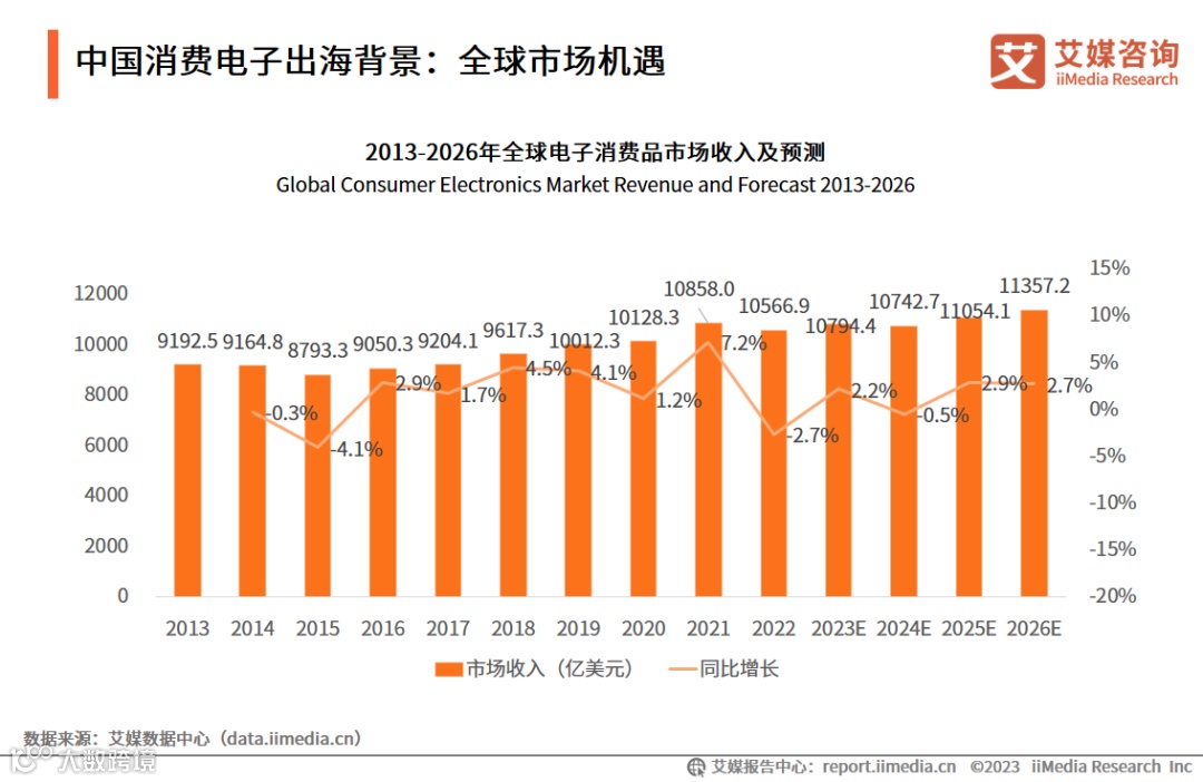 在移动互联网技术不断发展情况下,全球消费电子行业呈现稳定发展态势。iiMedia Research(艾媒咨询)数据显示,2013-2022年全球电子消费品市场收入总体发展较为平稳,相比2021年,2022年市场收入略有下降,为10566.9亿美元,预计2026年将达11357.2亿美元。未来,随着5G、人工智能等新兴技术与消费电子融合,将会加速产品更新迭代,推动全球电子消费品市场扩大规模,中国消费电子出海迎来全球市场发展机遇。