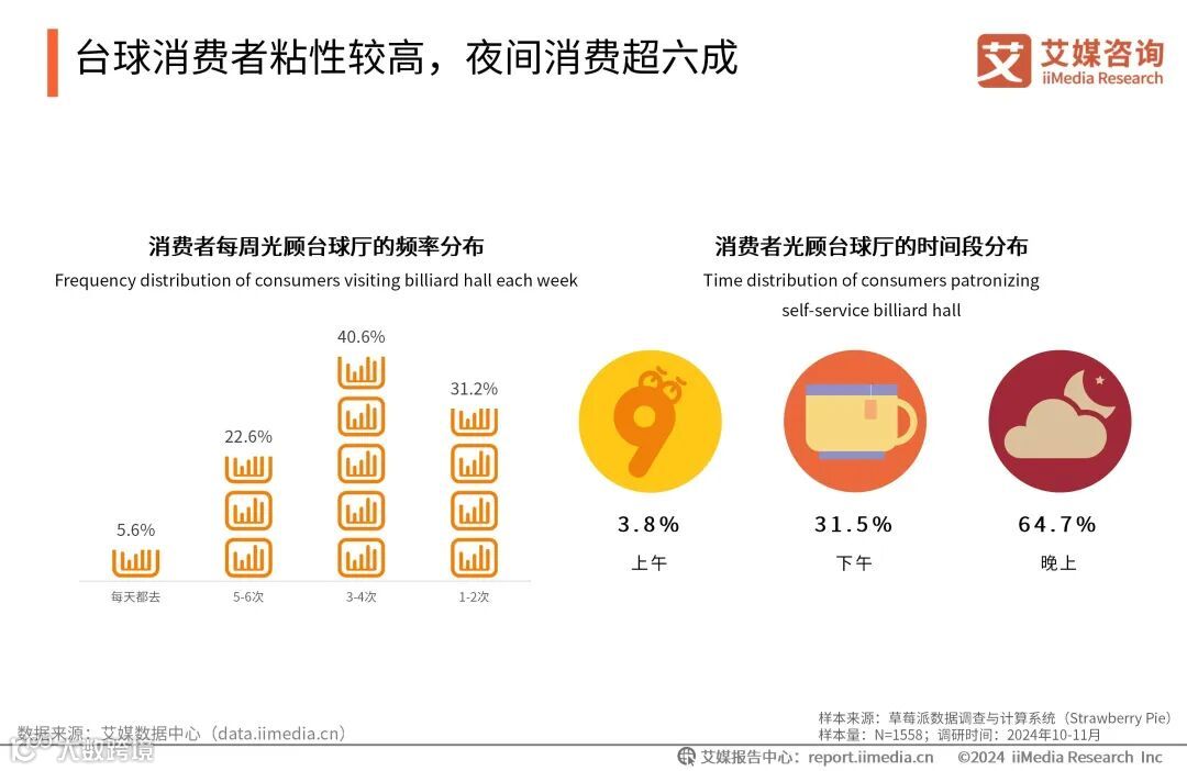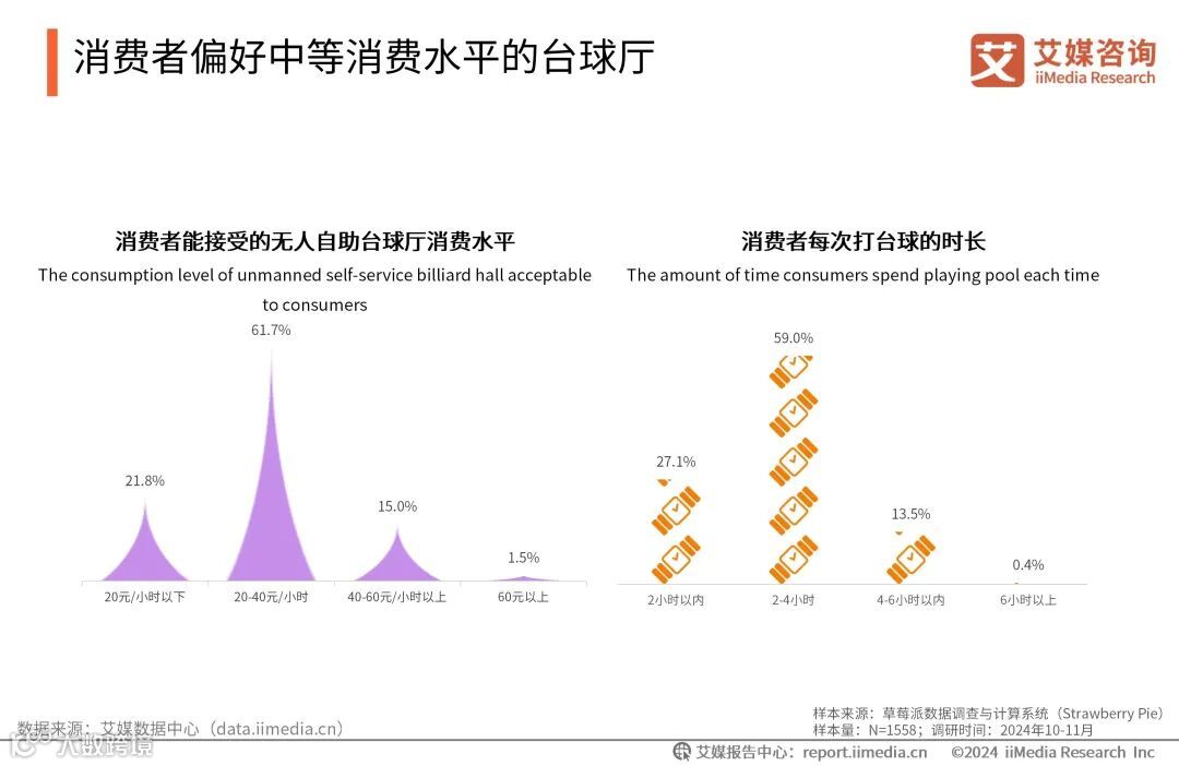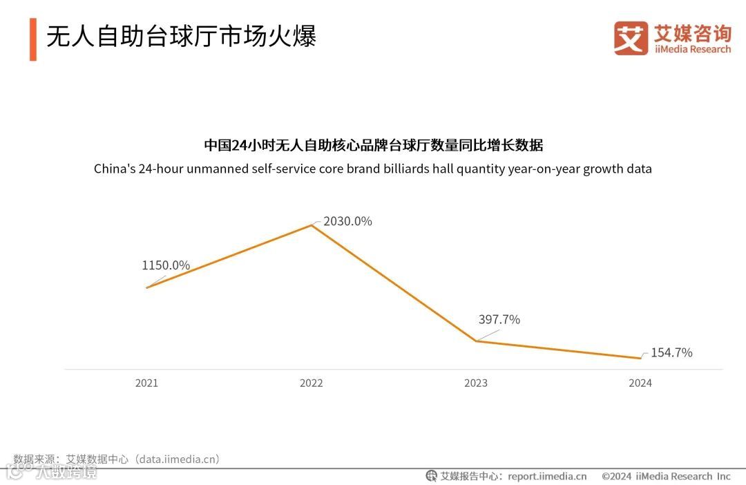 近年来,中国24小时无人自助台球厅经历迅猛发展。iiMedia Research(艾媒咨询)数据显示,2022年中国24小时无人自助台球厅数量同比增速高达2030.0%,2024年仍然保持高达154.7%的同比增幅。随着科技的进步和消费者对高效便捷服务需求的日益增长,无人自助台球厅凭借其24小时营业和自主服务的特点,正在逐渐赢得市场的广泛青睐,成为休闲娱乐领域新宠。