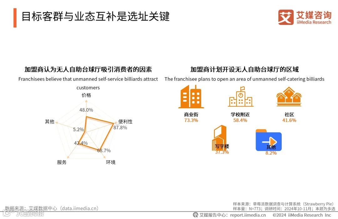 iiMedia Research(艾媒咨询)数据显示,便利性(87.8%)是加盟商认为无人自助台球厅吸引消费者的主要因素,其次是环境因素(68.7%);加盟商多计划在商业街(58.4%)和学校附近(41.6%)等区域开设无人自助台球厅。艾媒咨询分析师认为,自助台球厅的选址应综合考虑人流密集区域、目标客户群体、周边业态的互补性等因素,例如自助台球厅主要吸引年轻消费者,而大学生群体属于其目标客群,该群体拥有较多的自由时间和对娱乐休闲活动的高度需求,自助台球厅24小时营业的特性为学生提供了一个优质的休闲场所。