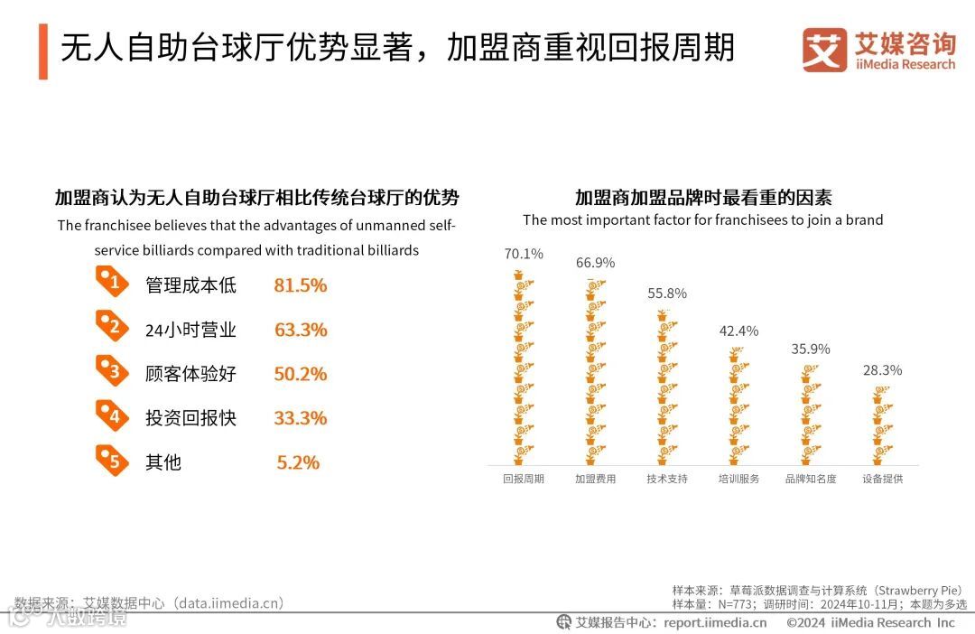 无人自助台球厅相比传统台球厅在管理端和消费端都有显著优势。iiMedia Research(艾媒咨询)数据显示,81.5%的加盟商认为无人自助台球厅相比传统台球厅的优势是管理成本更低,24小时营业(63.3%)和顾客体验更好(50.2%)也是无人自助台球厅的两大优势。加盟商选择加盟品牌时最看重的是回报周期(70.1%)的长短,其次是加盟费用(66.9%)和技术支持(55.8%)。加盟商在投资时主要考虑的是回报周期和加盟费用,其次是技术的支持程度。