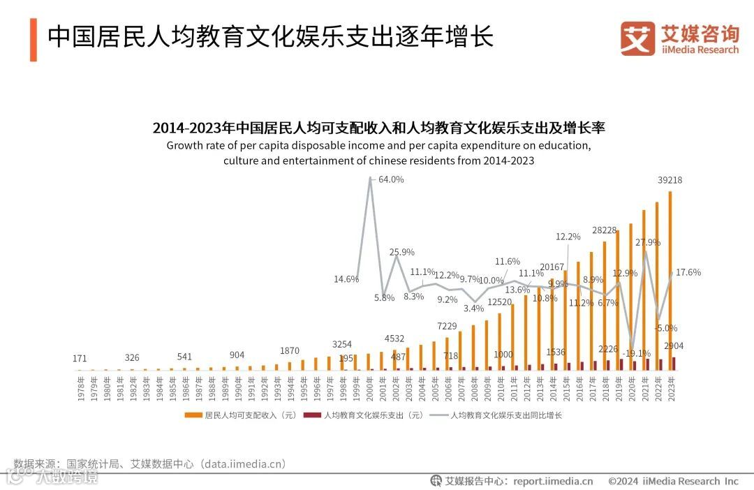 在消费升级的背景下,中国居民人均可支配收入和人均教育文化娱乐支出增长显著。数据显示,从1978年到2023年,中国居民人均可支配收入从171元增长到39218元,2023年中国人均教育文化娱乐支出达到2904元的历史新高,同比增长17.6%,显示出人们对于高品质的休闲娱乐体验有着强烈的消费意愿。