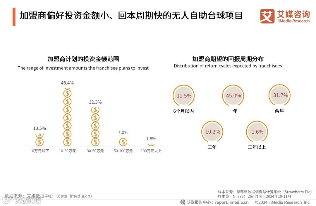 iiMedia Research(艾媒咨询)数据显示,近一半的加盟商计划的投资金额范围在10-30万元之间,32.3%的加盟商可以接受投资金额在30-50万元之间。一年和两年是加盟商期望的回报周期的集中分布区,分别占比45.0%和31.7%。加盟商计划投资金额较低,且期待的回报周期较短,无人自助台球的优势是投资规模小,回报周期短,符合加盟商的心理预期。