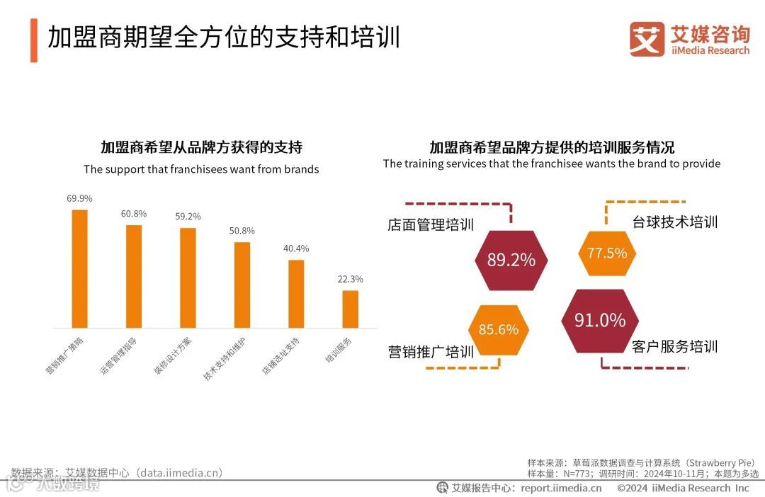 iiMedia Research(艾媒咨询)数据显示,营销推广策略(69.9%)是加盟商最希望从品牌方获得的支持,加盟商同样迫切需要运营管理(60.8%)、装修设计(59.2%),以及技术和维护(50.8%)方面的支持。91.0%的加盟商需要客户服务方面的培训,店面管理(89.2%)、营销推广(85.6%)、台球技术(77.5%)等方面的培训需求同样迫切。加盟商在加盟过程中,期望品牌方能够提供全方位的支持和培训,以降低经营风险,提高店铺的运营效率和盈利能力。