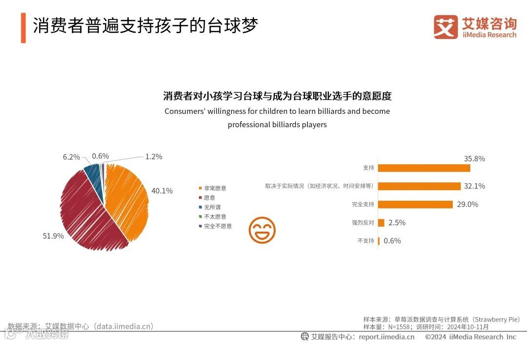 iiMedia Research(艾媒咨询)数据显示,有92.0%的消费者愿意小孩学习台球,仅有1.2%的消费者完全不愿意小孩学习台球。64.8%的消费者支持小孩成为台球职业选手,另有32.1%的消费者在条件允许的情况下,不会反对小孩成为职业选手。在如今台球普及率不断提高和台球职业联赛不断完善的情况下,消费者对小孩学习乃至选择职业台球道路的支持力度越来越大。