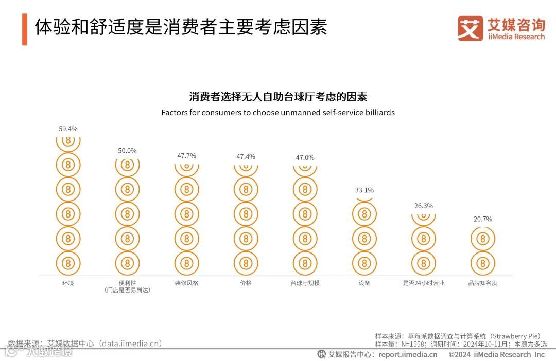 iiMedia Research(艾媒咨询)数据显示,环境因素(59.4%)是消费者选择无人自助台球厅时考虑的最主要因素,其次,便利性(50.0%)、装修风格(47.7%)、价格(47.4%)、台球厅规模(47.0%)也是消费者主要考虑的因素。消费者非常关注台球活动时的体验和舒适度,台球厅的环境是吸引消费者的关键。