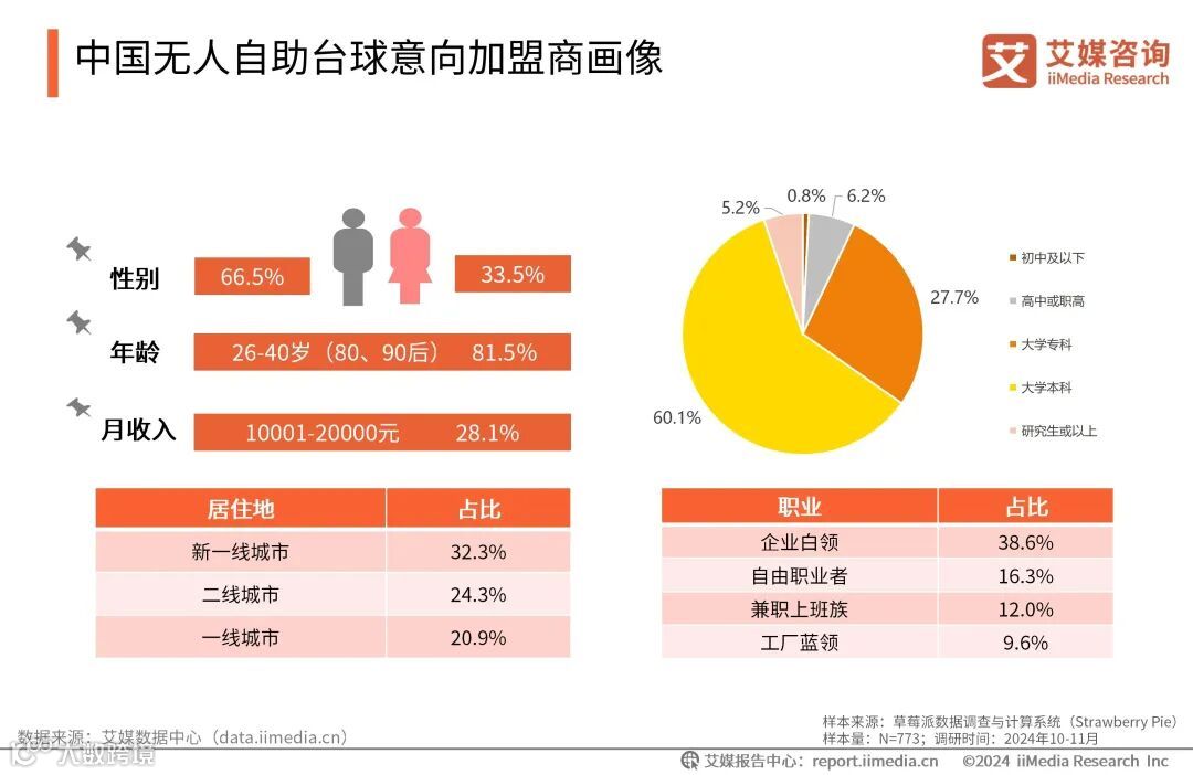 iiMedia Research(艾媒咨询)数据显示,中国无人自助台球意向加盟商以中青年男性为主,受过高等教育,企业白领尤为明显,收入中等,大部分居住于新一线、二线与一线城市。