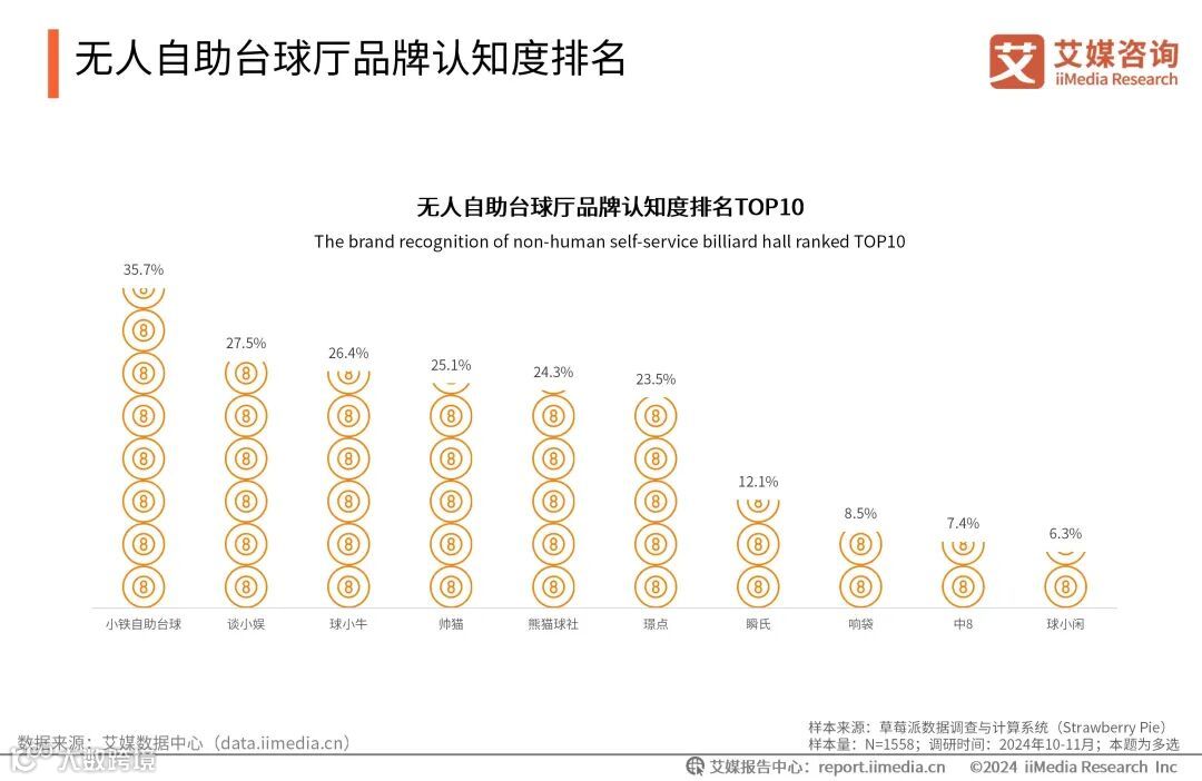 iiMedia Research(艾媒咨询)数据显示,在无人自助台球品牌消费者认知度调研中,上榜的品牌有小铁自助台球、谈小娱、球小牛、帅猫、熊猫球社、璟点、瞬氏、响袋、中8、球小闲。其中,小铁自助台球以35.7%的占比位列第一,谈小娱、球小牛分别以27.5%、26.4%的占比分列第二名、第三名。