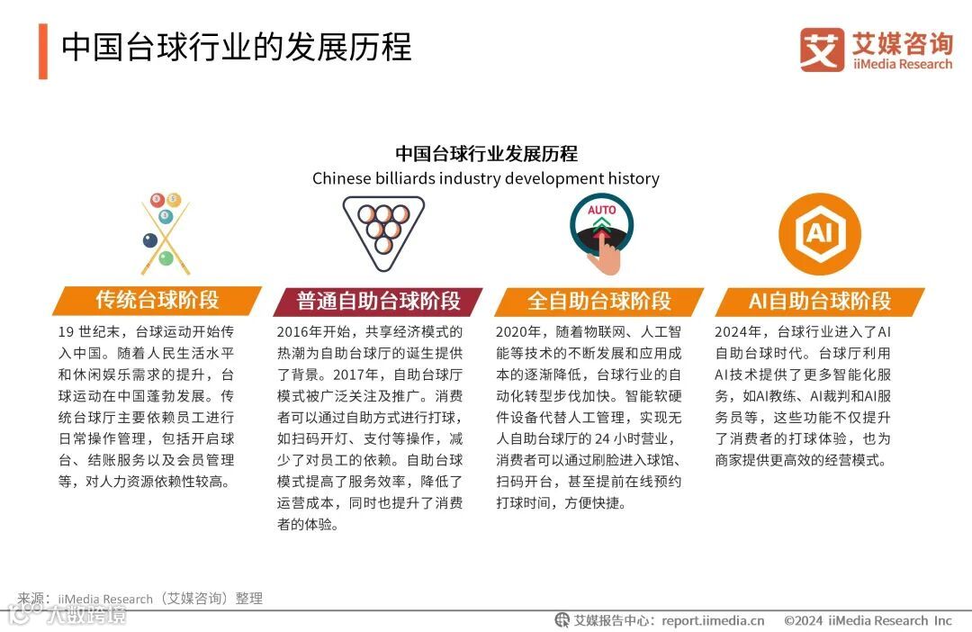 中国台球行业的发展历程是一个从传统到现代,从人工到智能的演变过程,反映了技术进步和消费习惯变化对行业发展的深远影响。具体来看,中国台球行业的发展可以分为传统台球、普通自助台球、全自助台球、AI自助台球阶段四个阶段。