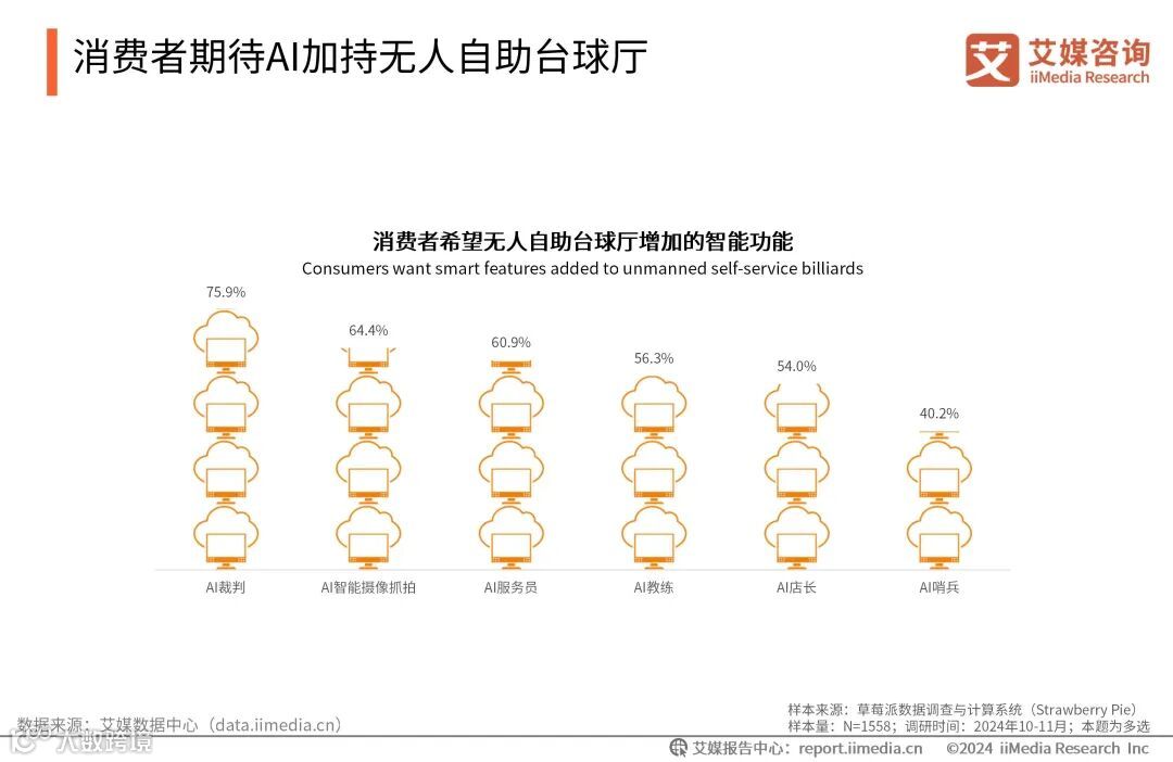 iiMedia Research(艾媒咨询)数据显示,75.9%的消费者希望增加AI裁判功能来保证客观公正的裁决,64.4%的消费者希望能通过AI智能自动捕捉生成影像视频记录,AI服务员功能(60.9%)以及AI教练功能(56.3%)等智能功能也备受消费者关注。无人自助台球厅应进一步提升和优化智能功能,满足消费者的需求。