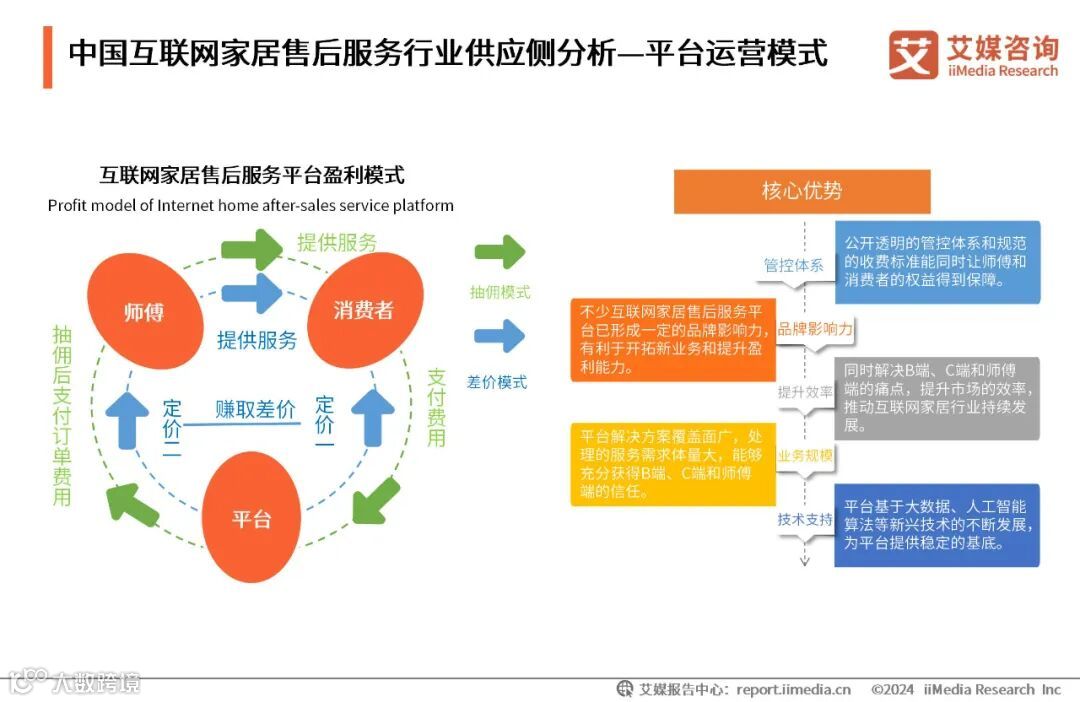 随着互联网和数字科技不断向家居领域渗透,其售后服务模式随之改变。消费者对个性化、便捷化的服务需求不断增长,专业的互联网家居售后服务平台涌现,其在管控体系、品牌影响力、效率、业务规模和技术等方面更具优势。互联网家居售后服务平台主要有抽佣模式和差价模式,前者是平台作为中介,抽取一定比例的服务费,后者是平台分别向消费者和师傅报价,从中赚取差价。
