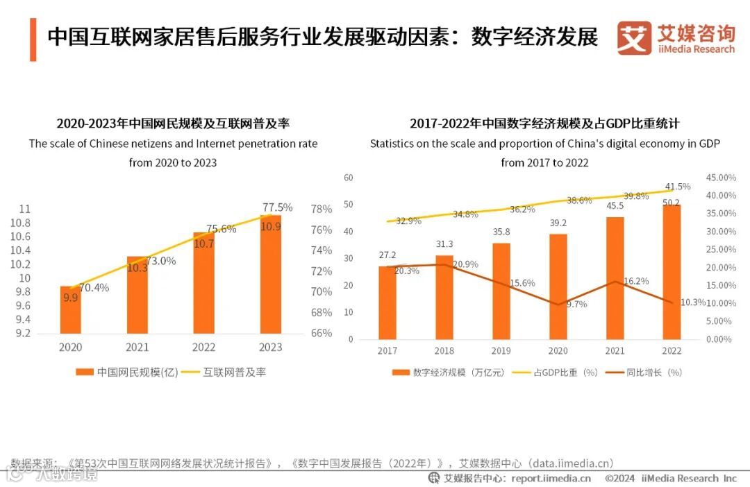 截至2023年12月,中国网民规模达10.9亿人,较2022年12月新增网民2480万人,互联网普及率达77.5%。2022年中国数字经济规模超过了50万亿元,占GDP比重为41.5%。数字经济作为新兴力量,正日益成为中国经济增长的“新引擎”。基于网民规模的扩大和数字经济的快速发展,中国家居厂商可通过互联网平台进行高效派单,跨区域解决家具安装等售后服务问题,实现降本增效,提升售后服务的效率和便捷性,满足消费者对于家居售后服务的个性化、便捷化需求。