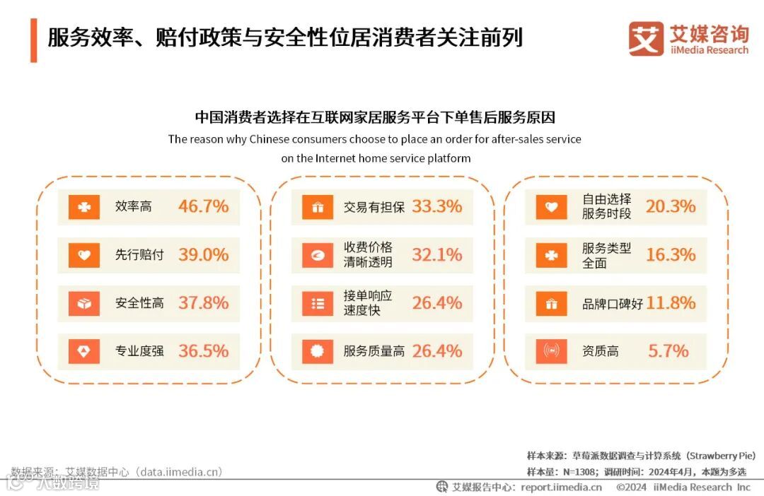 iiMedia Research(艾媒咨询)调研数据显示,高达46.7%的消费者认为服务效率是他们选择互联网家居服务平台的关键因素。其次,39.0%的消费者被先行赔付政策所吸引,显示出了消费者对于风险保障的高度关注,37.8%的消费者认为安全性高是其选择互联网家居服务平台的原因,36.5%的用户则看重平台的专业度。