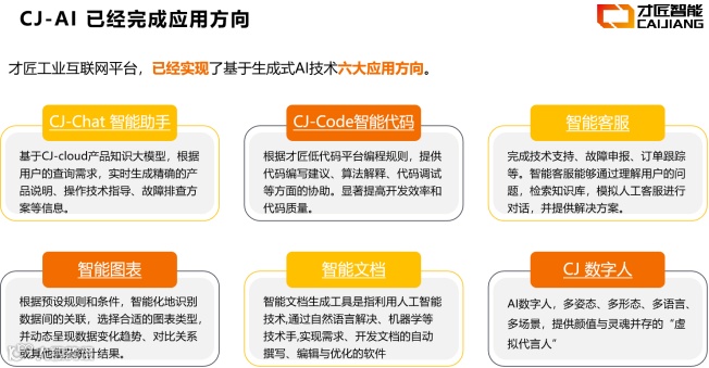 才匠智能工业互联网平台采用模块化架构,其核心是“AI+低代码”。平台利用低代码平台降低开发门槛,结合AI大模型技术实现自动化需求分析、代码生成、测试等,助力企业快速构建工业数字化制造运营解决方案,将业务流程、生产工艺、生产参数、工业技术原理、行业知识等封装成可重复使用的组件,通过可视化、拖拽式、模块化的方式,企业可以低成本、快速地构建工业应用系统,这些应用采用云计算技术,可以实现快速部署和轻量级使用,界面简洁,操作方便,易于学习和使用。