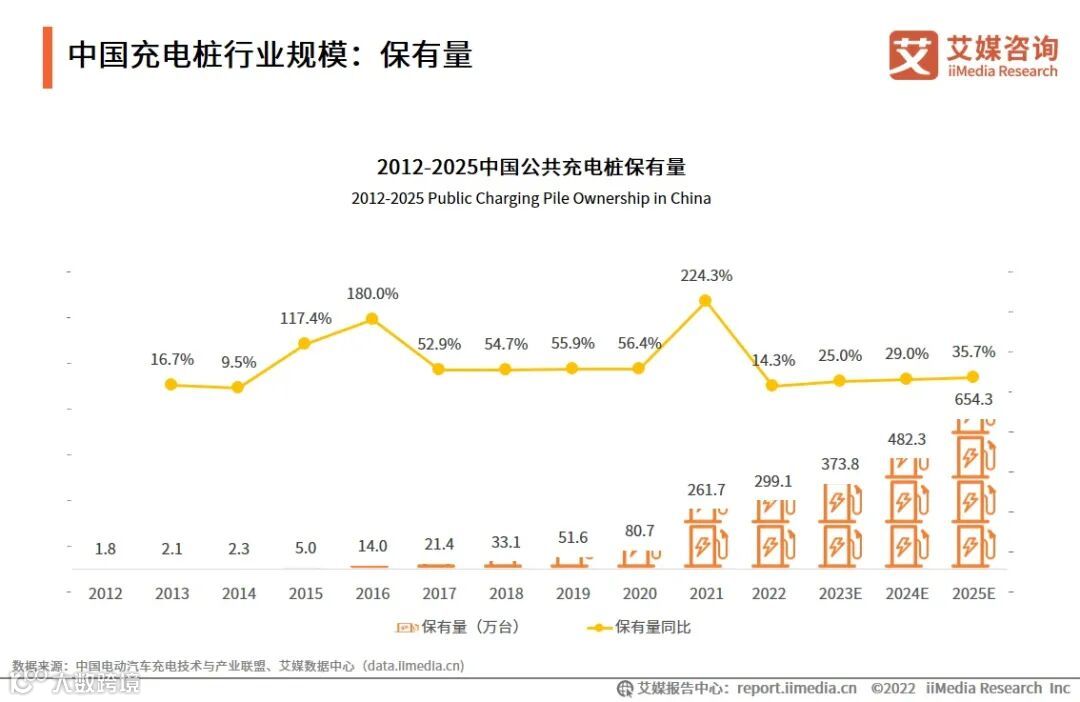 随着新能源汽车大规模普及和政策大力扶持,中国充电桩行业规模快速增长。为了满足电动汽车的安全充电需求,国家发展改革委等10个部门联合印发关于进一步提升电动汽车充电基础设施服务保障能力的实施意见,明确表示到“十四五”末,中国将形成适度超前、布局均衡、智能高效的充电基础设施体系,能够满足超过2000万台电动企业充电需求。预计2025年充电桩数量将达654.3万台,2021-2025年的年复合增长率为25.7%。