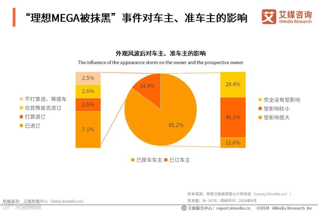 “理想MEGA被抹黑”事件对车主、准车主均有不同程度影响。iiMedia Research(艾媒咨询)调研数据显示,在85.2%的已提车车主中,受到影响的车主占56.8%,其中受影响很大的车主有11.6%,仅有28.4%的车主完全没有受影响;在14.8%已订车主中,已有7.1%的准车主选择了退订,仅有2.5%的准车主不打算退订。