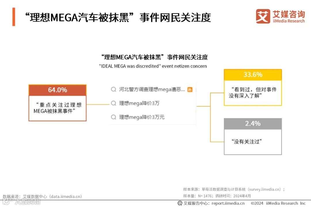 iiMedia Research(艾媒咨询)调研数据显示,大多数网民对“理想MEGA汽车被抹黑”事件比较关注,其中64.0%的网民重点关注过“理想MEGA被抹黑”事件,33.6%的网民看到过但没有深入了解相关事件。“理想MEGA被抹黑”事件涉及理想MEGA外观、理想汽车、理想汽车创始人李想等话题,后发展至理想MEGA价格、网络水军、恶意抹黑、小鹏汽车等话题。