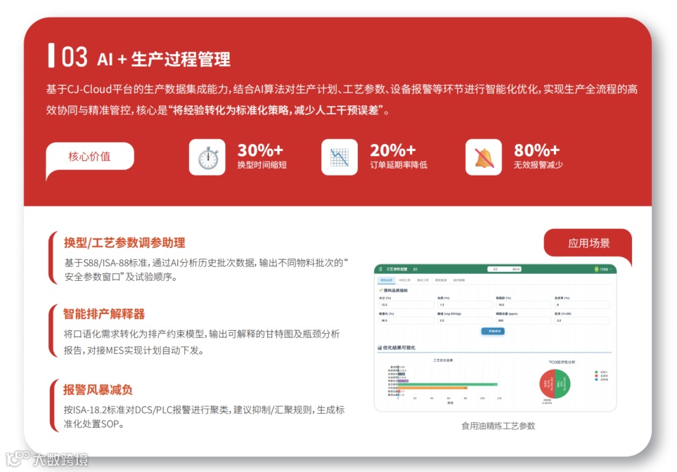 基于CJ-Cloud平台的生产数据集成能力,结合AI算法对生产计划、工艺参数、设备报警等环节进行智能化优化,实现生产全流程的高效协同与精准管控,核心是“将经验转化为标准化策略,减少人工干预误差”。