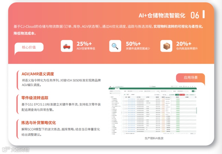 基于CJ-Cloud的仓储与物流数据(订单、库存、AGV状态等),通过AI优化调度、追踪与拣选流程,实现物料流转的可视化与柔性化,降低物流成本。