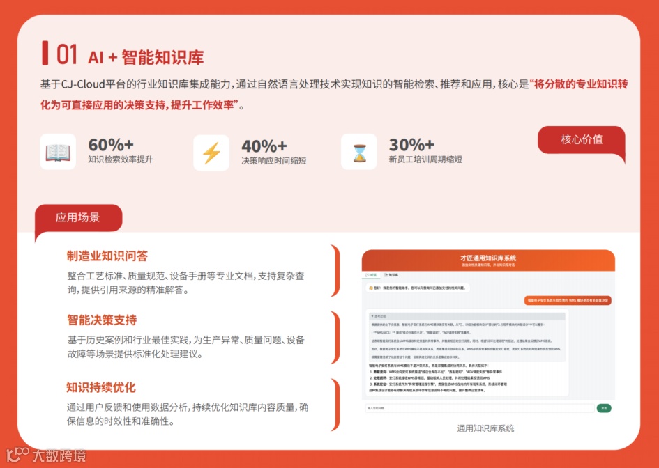 基于CJ-Cloud平台的行业知识库集成能力,通过自然语言处理技术实现知识的智能检索、推荐和应用,核心是“将分散的专业知识转化为可直接应用的决策支持,提升工作效率”。