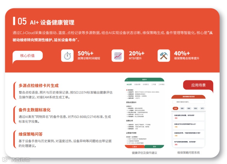 通过CJ-Cloud采集设备振动、温度、点检记录等多源数据,结合AI实现设备状态诊断、维保策略生成、备件管理等智能化,核心是“从被动维修转向预测性维护,延长设备寿命”。
