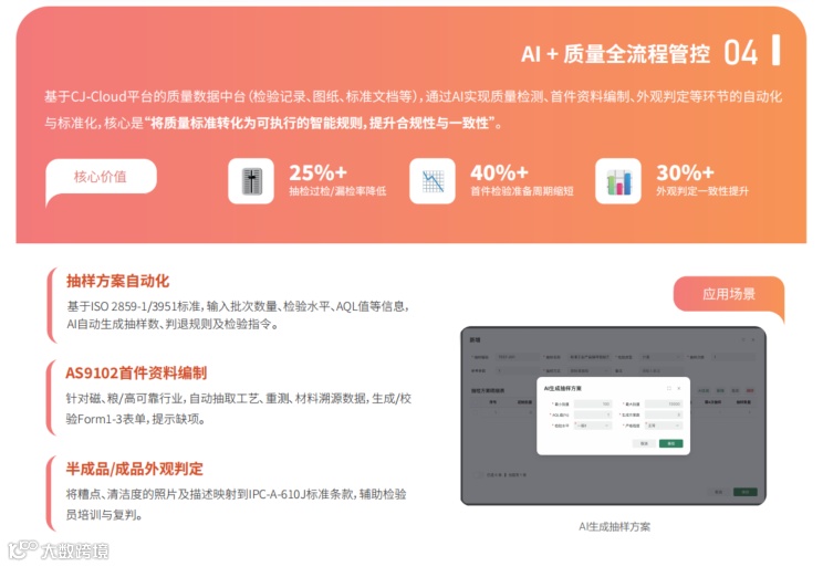 基于CJ-Cloud平台的质量数据中台(检验记录、图纸、标准文档等),通过AI实现质量检测、首件资料编制、外观判定等环节的自动化与标准化,核心是“将质量标准转化为可执行的智能规则,提升合规性与一致性”。