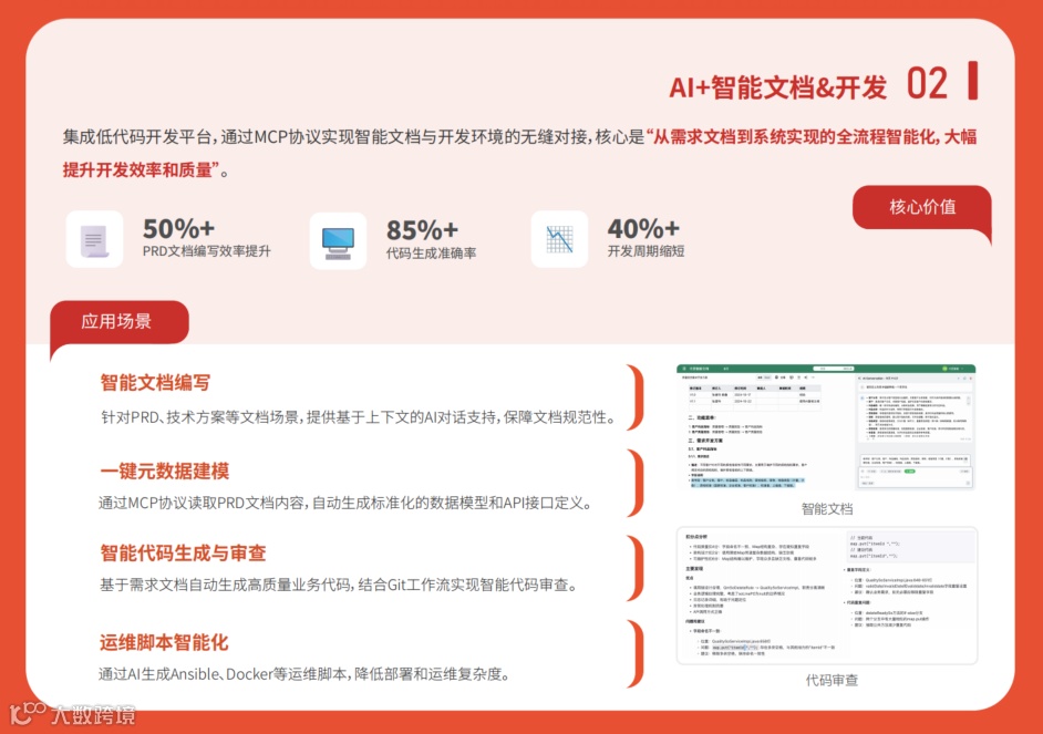 集成低代码开发平台,通过MCP协议实现智能文档与开发环境的无缝对接,核心是“从需求文档到系统实现的全流程智能化,大幅提升开发效率和质量”。