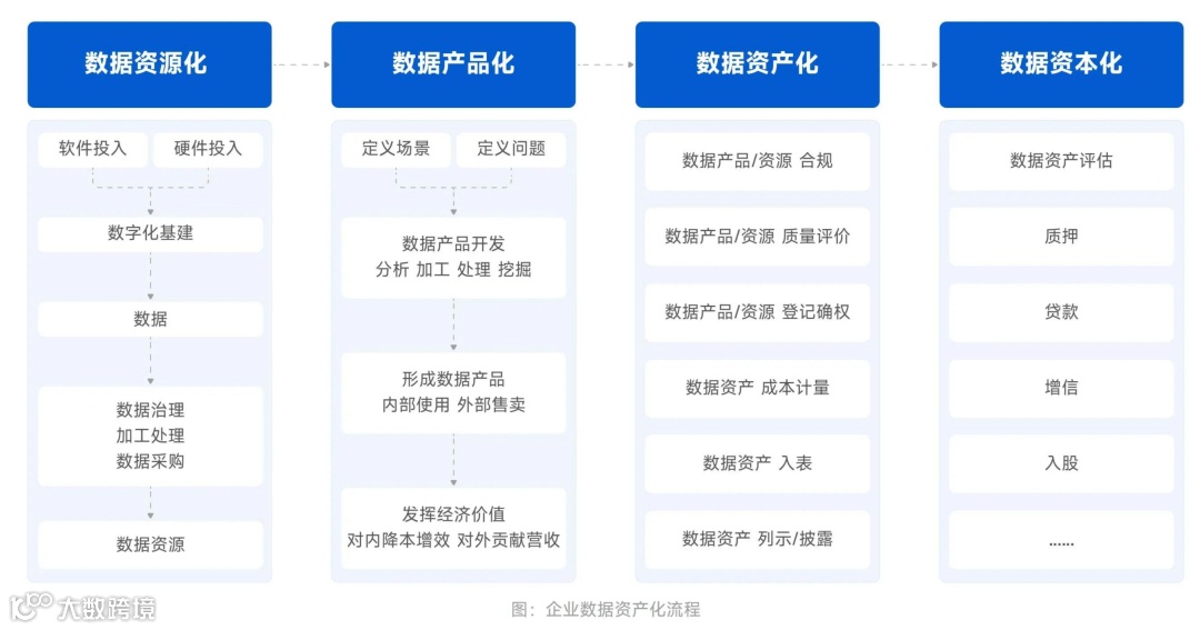 根据中国电子信息产业发展研究院、区块链研究院联合发布的《2023-2024中国数据资产发展研究报告》分析,数据资产市场化路径主要包括数据资源化、数据产品化、数据资产化和数据资本化四个阶段。
