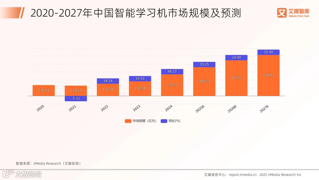 根据全球新经济产业第三方数据挖掘和分析机构iiMedia Research(艾媒咨询)发布的《2025年中国智能学习机行业发展状况和消费行为调查数据》显示,2024年中国教育智能硬件市场规模达962亿元,预计2025年达到1125亿元;2024年中国智能学习机市场规模达270.72亿元,预计2027年中国智能学习机市场规模将达到514.41亿元。